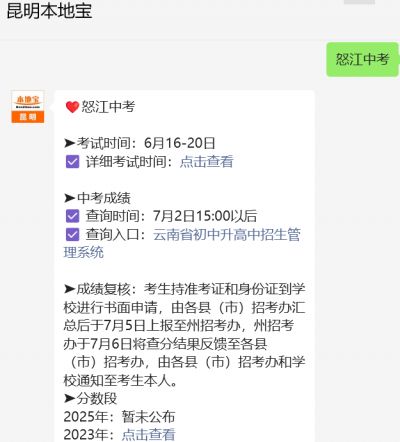 温馨提示:微信搜索公众号【昆明本地宝】,关注后在对话框回复【怒江中考】可获2025年怒江中考成绩公布时间+查询入口,八年级成绩查询方式,录取分数线,志愿填报时间+入口+填报流程,录取查询入口等;